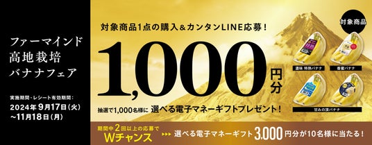 ファーマインドの特熟・甘みの頂・香密バナナを対象に、商品をご購入いただいた方の中から、抽選で1,000名様に【選べる電子マネーギフト1,000円分】が当たります。さらにダブルチャンスとして2回以上ご応募の方の中から抽選で【選べる電子マネーギフト3,000円分】を10名様にプレゼントいたします。