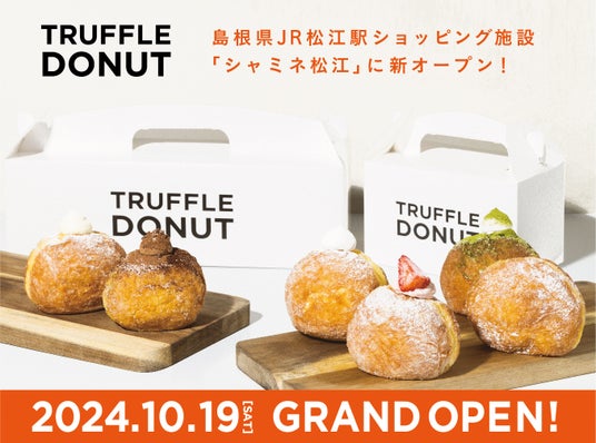 ふわふわ生地と、とろけるクリームが大人気の行列のできる生ドーナツ専門店「TRUFFLE DONUT(トリュフドーナツ)」を運営する株式会社トリクミ(代表取締役:古田 琢也)は、2024年10月19日(土)に「TRUFFLE DONUT(トリュフドーナツ)」 3号店を島根県JR松江駅にあるショッピング施設「シャミネ松江」にオープンいたします。