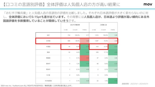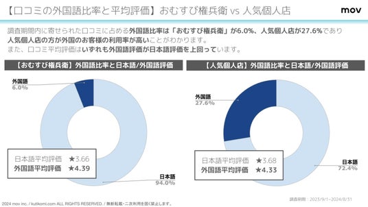 調査期間内に寄せられた口コミに占める外国語比率は「おむすび権兵衛」が6.0%、人気個人店が27.6%であり人気個人店の方が外国のお客様の利用率が高いことがわかります。また、口コミ平均評価はいずれも外国語評価が日本語評価を上回っています。