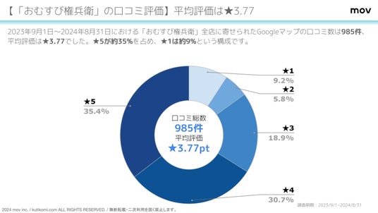 2023年9月1日~2024年8月31日における「おむすび権兵衛」全店に寄せられたGoogleマップの口コミ数は985件、平均評価は★3.77でした。★5が約35%を占め、★1は約9%という構成です。