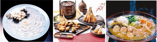 (左)【博多い津゛み】ふく刺しセット 24,840円 ※限定50セット (中)【串乃屋】迎春串揚げセット「亀」 10,800円※限定60セット (右)【日本料理なだ万】とり鍋セット 10,800円 ※限定30セット