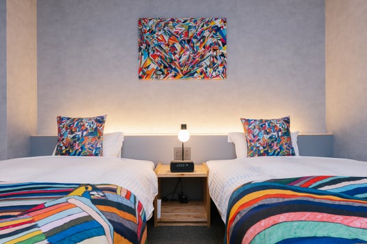 いろいろなひと、いろいろな価値観、いろいろなライフスタイルが盛岡で「まざり」合い、新たな宿泊体験を通して文化を「うむ」という意味が込められています。いろんなひと、いろんな価値観、いろんなライフスタイルがまざりあうホテルの象徴として、知的障害のあるアーティストの作品で飾られた客室での唯一無二の滞在体験をお楽しみいただけます。
