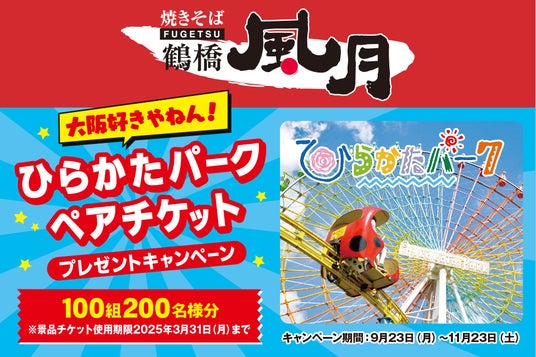 今回、「鶴橋風月焼きそば」を通じて、大阪の魅力をもっと実感していただきたいとの思いから、子どもから大人まで楽しめる遊園地「ひらかたパーク」のペアチケットが抽選で100組200名に当たるプレゼントキャンペーンを実施します。「風月」の“焼きそば”を食べて「ひらパー」に行ける、大阪を大満喫できるキャンペーンに、ぜひご応募ください。