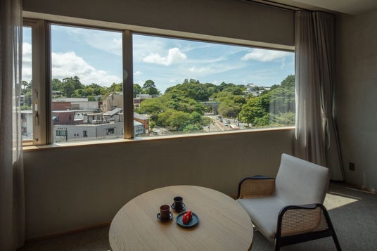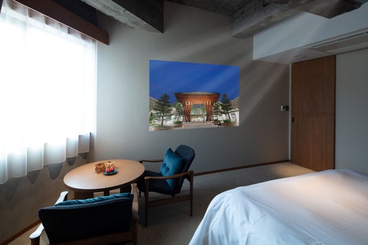 兼六園の木々を眺める「青スイート」。アートや家具を散りばめた客室は、洗練された落ち着いた空間が広がります。