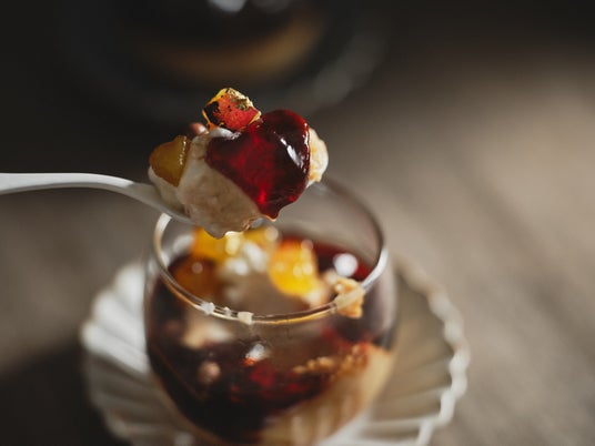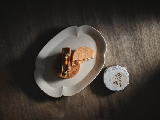 林檎のジュレ、キャラメルムース、カモミールと林檎ピューレを合わせたマスカルポーネムースを