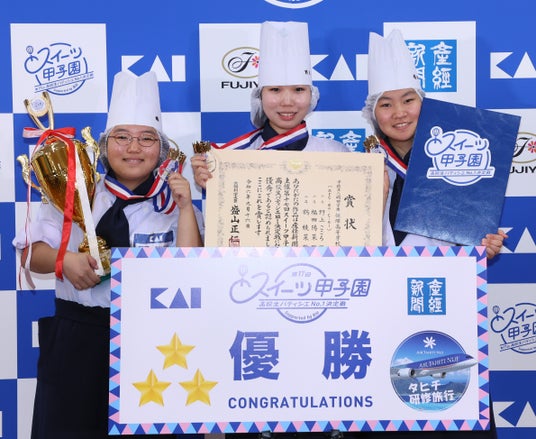 準優勝は城南高等専修学校(岐阜)の「reve」、3位は育成調理師専門学校高等課程(兵庫)の「RPG」が受賞。各企業賞には、貝印賞(貝印株式会社)に「reve」、ペコちゃん賞(株式会社不二家)に野田鎌田学園高等専修学校(千葉)の「fortuna」、タリーズ賞(タリーズコーヒージャパン株式会社)に向陽高等学校(長崎)の「sourire」、パストリーゼ賞(一般財団法人ドーバー洋酒財団)に「RPG」がそれぞれ選ばれました。