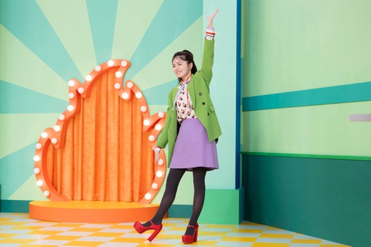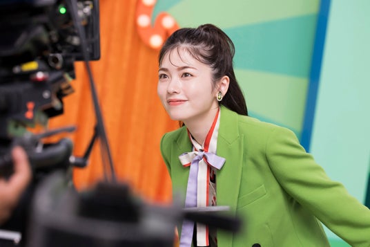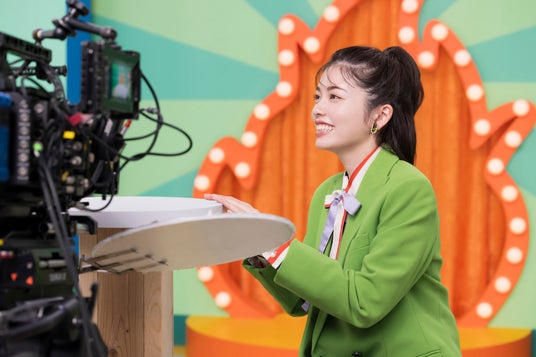 カラフルなセットに合わせて、黄緑のジャケットに紫のスカート、赤いハイヒールという装いで現場入りした小芝さん。これまでのCMシリーズと雰囲気がガラッと変わったセットや衣装に、小芝さんも 『“ショータイム!!”という感じで、テンションも自然と上がり、とても楽しいです!』 と、心を踊らせている様子でした。