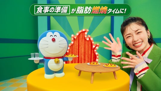 また、ドラえもんがステージで “脂肪燃焼タイム”を紹介するシーンの撮影では、マジックのようにテンポよく出現する商品やドラえもんに合わせて、見事なリアクションをとっていく小芝さんに注目です。