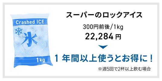 ただ、中々専門店で丸氷を買っている人はそこまで多くはなく、スーパーのロックアイスを買っている人がおおいのではないでしょうか?ロックアイスでも300円/kg前後かかってきます。