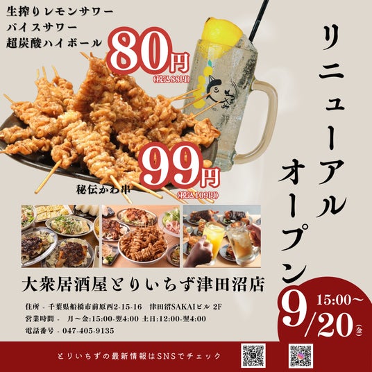 2024年9月20日(金)15時、『大衆居酒屋 とりいちず 津田沼店』がリニューアルオープン。リニューアルに伴い、グランドメニューも新しくなります!
