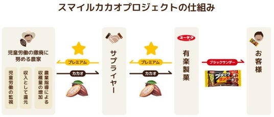有楽製菓では、2020年より本活動を開始し、使用するカカオ原料に対して児童労働問題に配慮された原料への切り替えを行ってまいりました。2022年9月には主力商品である「ブラックサンダー」、「ブラックサンダーミニバー」の100%切り替えが完了。さらに本活動に精力的に取り組み2024年7月生産商品より有楽製菓が使用するカカオ原料の100%切り替えが完了いたしました。(※)