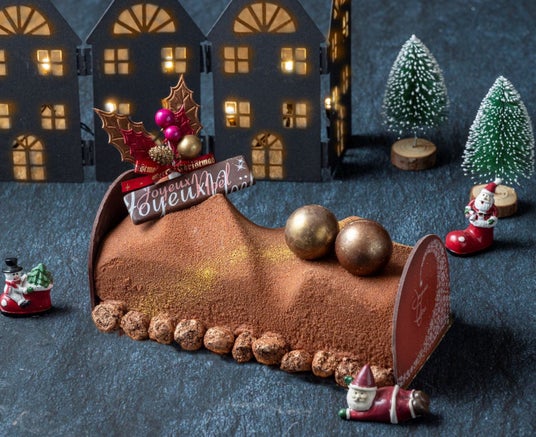 フランスの伝統的なケーキ、ブッシュ・ド・ノエルを香り高いマダガスカル産カカオを使用したまろやかなムースで仕上げました。なかにはヘーゼルナッツを加えて芳ばしく焼き上げたダックワーズを底に敷き、ヘーゼルナッツとミルクチョコレートのフィアンティーヌ、爽やかなレモンのクリームを層にしました。樹木を思わせるぬくもり溢れるケーキは誰からも愛される一品です。