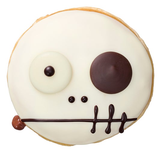 『ホワイトチョコ スカル』 は、ホワイトチョコでつつまれた顔に、ホワイトチョコとミルクチョコのおどけた目玉でコワ可愛いスカルをイメージしたドーナツです。中には、口どけなめらかな生チョコ入りのクリームを入れたチョコづくしの一品です。