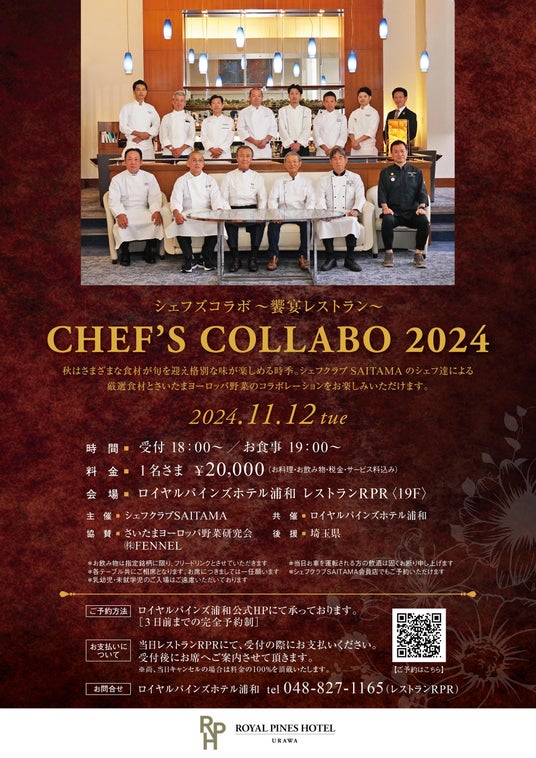 ソラーレ ホテルズ アンド リゾーツ株式会社(所在地:東京都港区、代表取締役社長:井上 理)が運営するロイヤルパインズホテル浦和は、埼玉県のトップシェフが集う一夜限りの 夢の饗宴「シェフズコラボ2024」を11月12日(火)ロイヤルパインズホテル浦和で開催いたします。秋の味覚をふんだんに使ったプレミアムなコース料理を是非ご堪能下さい。