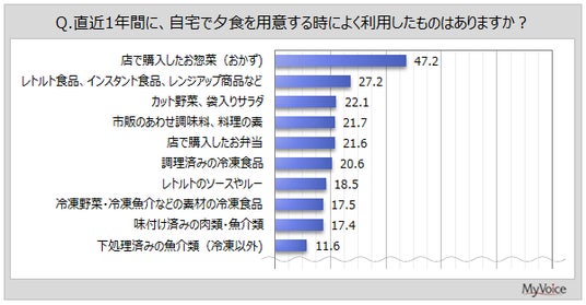 直近1年間に、自宅で夕食を用意する時によく利用したものは(複数回答)、「店で購入したお惣菜」が47.2%、「レトルト食品、インスタント食品、レンジアップ商品など」が27.2%です。「カット野菜、袋入りサラダ」「市販のあわせ調味料、料理の素」「店で購入したお弁当」「調理済みの冷凍食品」が各2割強で続きます。
