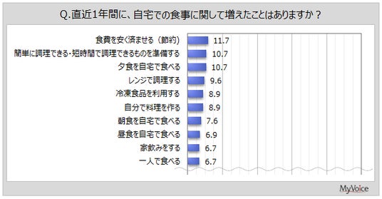 直近1年間に、自宅での食事に関して増えたことは(複数回答)、「食費を安く済ませる」「簡単に調理できる・短時間で調理できるものを準備する」「夕食を自宅で食べる」が各1割強です。