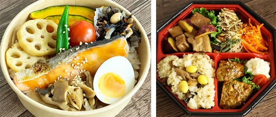 (左)『国産秋さけと彩り野菜の弁当』/(右)『秋を感じる!角煮と豆腐ハンバーグのきのこご飯弁当』