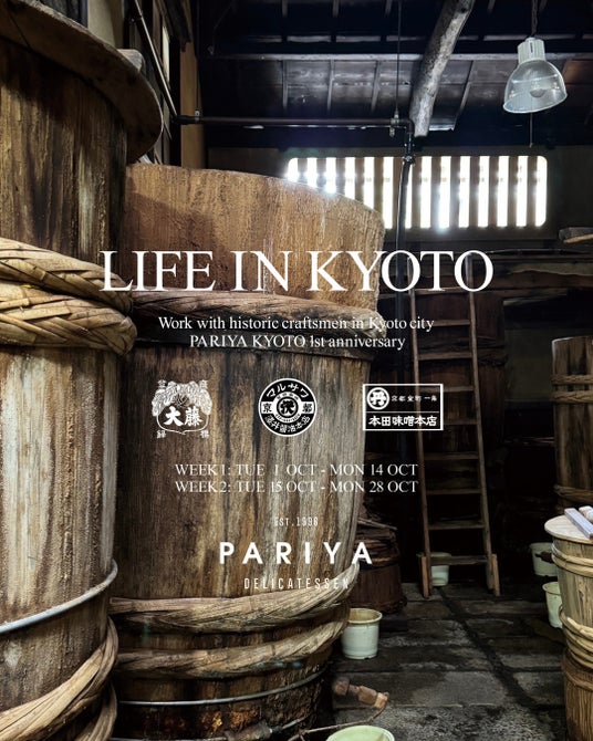 株式会社マッシュライフラボ(代表取締役社長:満塩雅一、本社:東京都千代田区)が運営するPARIYA DELICATESSEN(パリヤ デリカテッセン、以下PARIYA)は、京都店の出店から1周年を迎えることを記念して、西京味噌醸造元「本田味噌本店」、木樽で二度熟成させる再仕込醤油「澤井醤油本店」、千枚漬を生み出した「千枚漬本家 大藤」という、京都の食を百数十年以上もの古から支え続ける老舗3店の調味料・漬物を使用したデリやジェラートを期間限定で提供するイベント『LIFE IN KYOTO』を、2024年10月1日からPARIYA全10店で実施いたします。