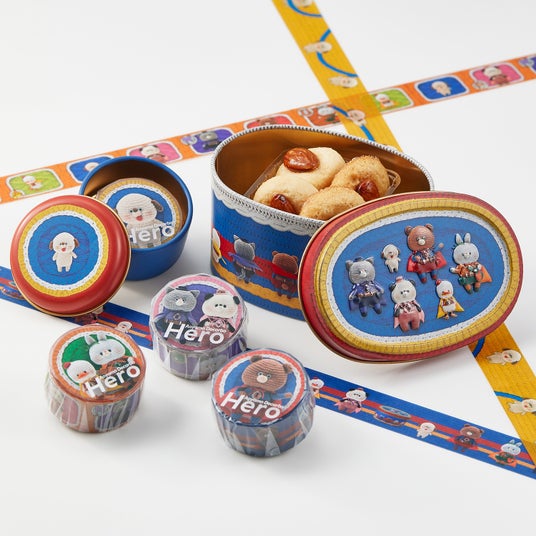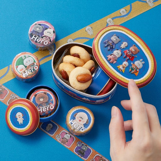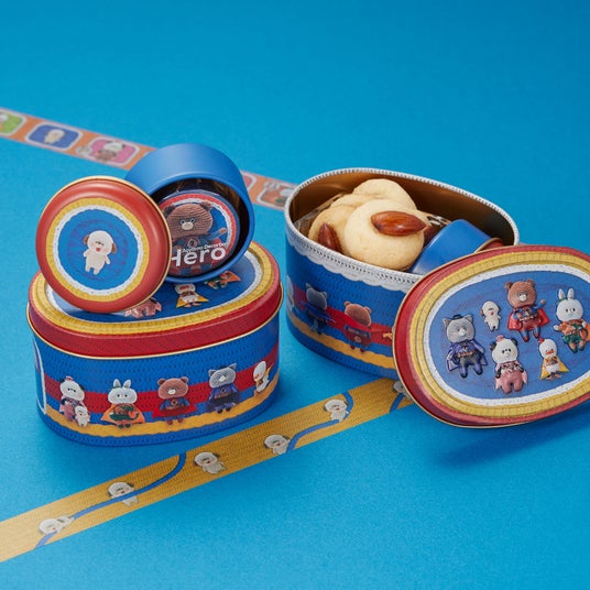 ヒーロースタイルの5匹のどうぶつたちと、1匹の小さいいぬがテーマの『ヒーロー缶』。