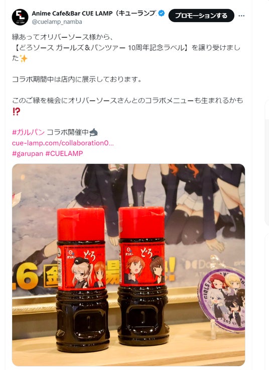 2024年4月~6月まで開催しておりました「ガールズ&パンツァー 最終章 Barどん底style」の開催中に、神戸市の老舗ソースメーカー・株式会社オリバーソースの「どろソース ガールズ&パンツァー 10周年記念ラベル」の展示をさせていただいたご縁から、コラボメニュー販売が決定いたしました。