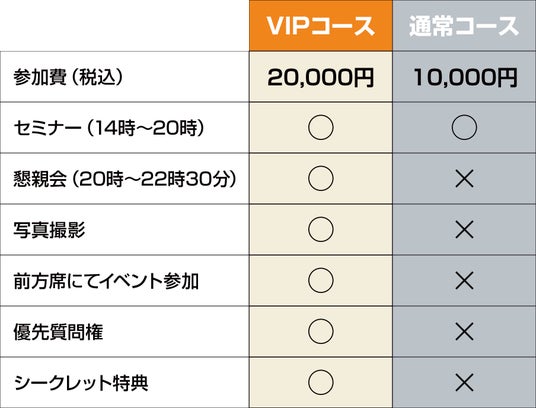 本イベントの参加には【イベント+懇親会付き】のVIPコースをご用意しております。VIPコースはセミナーへ登壇する講師や特別ゲストが参加する懇親会への参加権利が付与されております。弊社代表宮脇咲をはじめ、講師やゲストとも直接話すことができるVIPコースの特典をご確認ください。