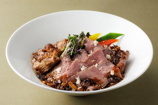 ローストビーフと照り焼きチキンを一度に味わえる、贅沢な二色盛の丼ぶり。柔らかい赤身ロースを低温調理でじっくりと火入れしてしっとりさせたローストビーフは、旬のきのことともに醤油ベースのソースで仕上げました。しっかりとした肉質と旨味を引き立てた照り焼きは、青森の津軽りんごを食べて育った津軽どりを使用。甘辛い風味が食欲をそそります。カラフルな季節の野菜をお口直しに、ホテルならではの贅沢な逸品をご堪能ください。
