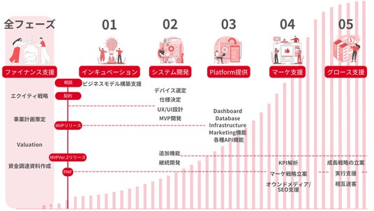 C2C社は、「シコメル」のビジネスインキュベーション支援からシステム機能開発、マーケティング/グロース支援までを一気通貫で伴走しております。