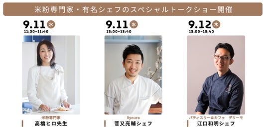 展示会期間中には、専門家の高橋ヒロ先生、製菓業界の第一線で活躍する菅又亮輔シェフ・江口和明シェフらによるトークショーも開催し、米粉を使った商品開発や店舗運営のポイントについてお話しいただきました。質問タイムを設けるなど、参加者様の米粉に関する疑問を解消できる時間となりました。どの回も、用意したスペースを超えてご来場者様で溢れかえり、米粉への関心の高さを感じることができました。