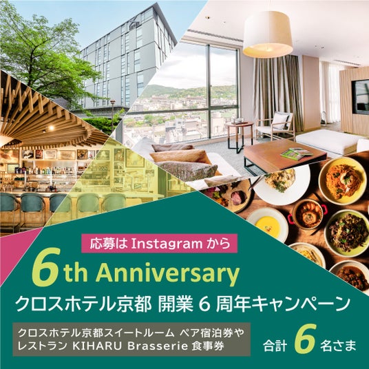この度、開業6周年のお祝いと6年間の感謝の気持ちを込めて、プレミアムスイートの無料ペア宿泊券(1名さま)や秋の味覚満載のランチに利用可能なレストラン&バー「KIHARU Brasserie」の5,000円分のお食事券(5名さま)を、合計6名さまにプレゼントするキャンペーンをクロスホテル京都 公式Instagramにて実施します。