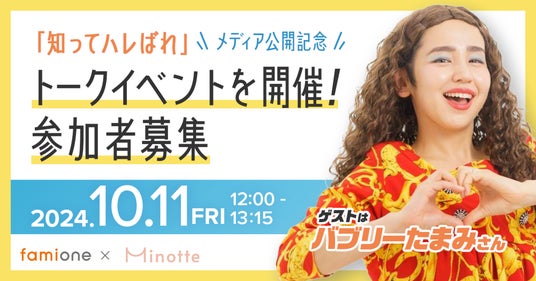 メディアサイト「知ってハレばれ」の公開を記念して、2024年10月11日(金)のランチタイムにオンラインイベントを開催します。ファミワン代表の石川 勇介とリボン食品代表の筏 由加子に加え、ママ界のエンターテイナーであるバブリーたまみさんをゲストに迎えメディア開設の想いや世の中への願い、みなさまへのエールなどをオープニングイベントにてお伝えします。