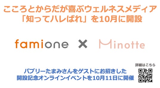 「子どもを願うすべての人によりそい 幸せな人生を歩める社会をつくる」をビジョンに掲げ、法人の従業員向け福利厚生や自治体の住民向け支援を行うヘルスケアサポートサービス「ファミワン」 https://famione.com/benefit/ などを展開する株式会社ファミワン(本社:東京都渋谷区、代表取締役:石川勇介、以下当社)は、女性の心身のゆらぎを食でサポートする「Minotte(ミノッテ)」を運営するリボン食品株式会社(本社:大阪府大阪市、代表取締役:筏 由加子、以下リボン食品)との共同プロジェクトとして、『こころとからだが喜ぶウェルネスメディア「知ってハレばれ」』を10月にオープンいたします。