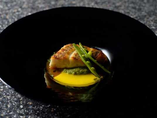 新鮮な白身魚を香草のきいたヴェルモットで蒸し焼きにし、魚介から丁寧に調理したブイヤベースにサフランの香りをのせています。