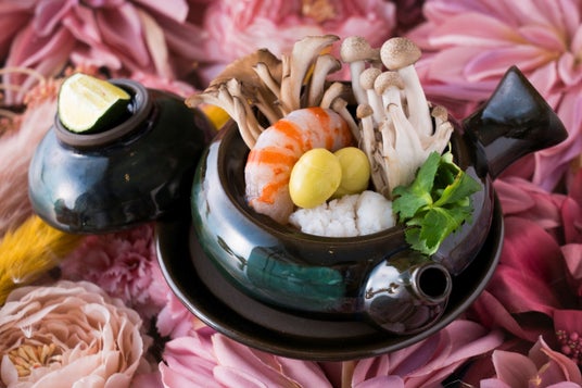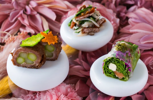前菜は、アスパラガスを牛ロースで巻き、木の葉を象った人参の素揚げやさつまいもを飾ることで、風で葉が吹き寄せられる風景を表現した「牛ロース肉のアスパラ巻き」と、フレッシュなサラダ、チーズと明太子を生春巻きの皮で巻き、バジルソースで洋風に味を調えた「フラワーサラダ」、水菜のシャキシャキとした食感と柿の甘味が楽しめる「水菜、茸(きのこ)、干し柿のお浸し」をご用意致しました。きのこ、銀杏、鱧などの秋から冬にかけて旬を迎える食材で創る「きのこの土瓶蒸し」は、出汁の上品な香りと食材の旨味から奥深い風味を感じられ、長く続いた残暑の疲れを癒す料理長自慢の一品です。