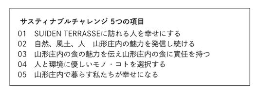 地球環境の破壊や紛争問題、原料やエネルギーコスト高騰など世界規模で課題が山積する中、2024年度も〈サスティナブルチャレンジ〉への取り組みを継続しています。下記の5項目を行動指針としホテルの重要なサービスである食や滞在を通して社会課題に取り組むだけではなく、お客様が庄内の人と関わり土地の魅力に触れる機会の造成、そして私たちスタッフの幸せの追求など、多角的な視点で取り組んでまいります。