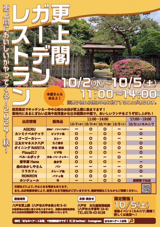 八戸市は、2024年10月2日(水)から10月5日(土)まで国有形文化財「更上閣」を会場にランチイベント「更上閣ガーデンレストラン 更上閣においしいがやってくる!2024~秋~」を開催いたします。