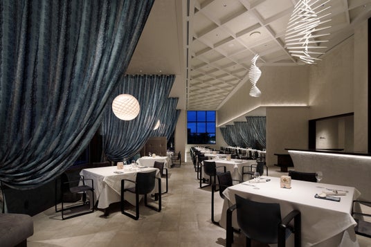 ダイニングは、高さ5mの天井が生み出す開放的な空間が広がり、海と?い砂浜を連想させる?と?を基調とした内装です。海のすぐ側にありながら窓を全てオープンにせず、海の存在を感じながらもテーブルの上に意識を向ける、食事をゆっくり楽しめる空間です。