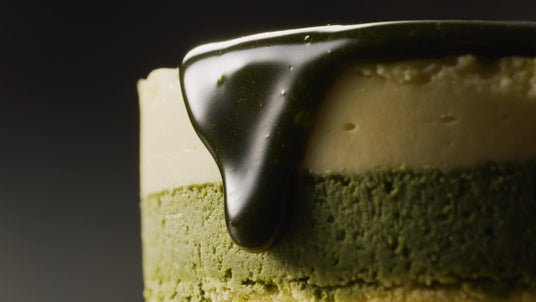 下層は抹茶のベイクドチーズケーキ。上層はレアチーズのムース。表面には抹茶のナパージュをかけ濃い抹茶の苦みを感じるチーズケーキです。