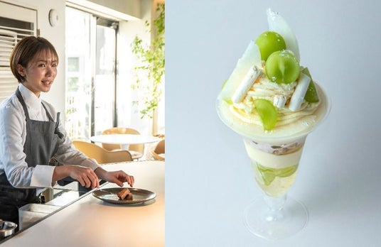 <ジャニス・ウォン>のオープニングスタッフ、レストランパティシエを経て「皿盛りデザート」の意を冠する<un plato>を開業した森井シェフ。限定販売のパフェは、旬の和梨とシャインマスカットに、梅のグラニテやすだちを合わせた爽やかなパフェ。皿上で構築していくライブ感も圧巻です。