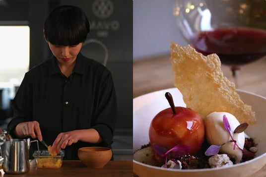 京都にある本店では、ワインのように嗜むブレンドした日本茶と、カウンター席で仕上げられるアシェットデセールのペアリングフルコースを提供する<MAVO bloom>。都内有名パティスリーで研鑽を積んだ畑谷シェフがシェフパティシエを勤めています。伊勢丹新宿店限定のデセールは、タルトタタンからインスピレーションを受けて出来上がったひと皿。アールグレイのムースにマスカルポーネのクリーム、アクセントにはベルガモットのジュレを使用しており、タルトタタンを連想させながらも新しい味わいになっております。