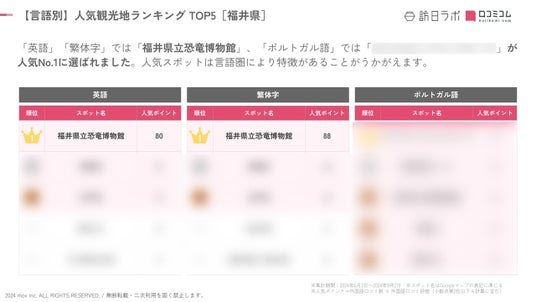 - 福井県でインバウンドに人気の観光地No.1は「福井県立恐竜博物館」