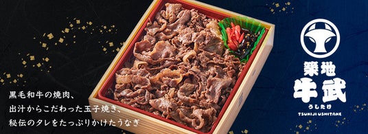 「築地 牛武」では、バラ、ランプ、肩の食感が楽しめる厳選されたA5ランクの国産黒毛和牛焼肉と、出汁からこだわった玉子焼きを楽しめる「黒毛和牛焼肉&玉子焼き弁当」1,900円(税込)、秘伝のタレをたっぷりかけたうなぎとこだわりの玉子焼きの「うなぎ&玉子焼き弁当」1,620円(税込)などをお好みでご賞味いただけるよう取り揃えました。