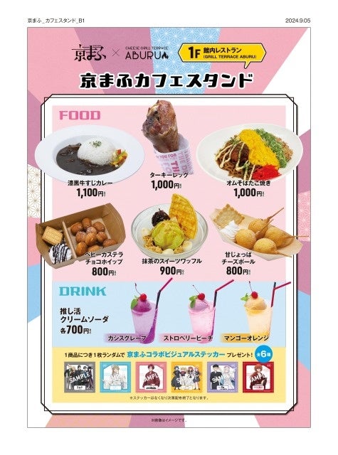 みやこめっせ1階第2展示場内の「京まふカフェスタンド」にて、2023年同様に販売ブースでフードとドリンクを提供します。対象メニュー1商品ご購入につき「京まふコラボビジュアルステッカー(全6種)」をランダムで1枚プレゼント!