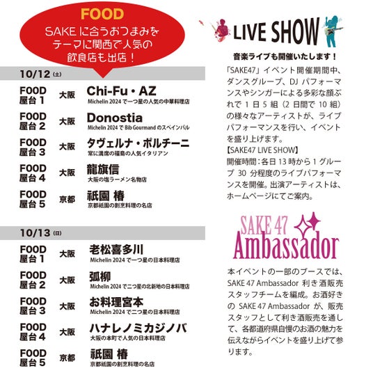 その第一弾として来る2024年10月に下記内容で「美食と音楽で楽しむニッポンのSAKE祭典 SAKE47(以下本イベント)」を開催いたします。