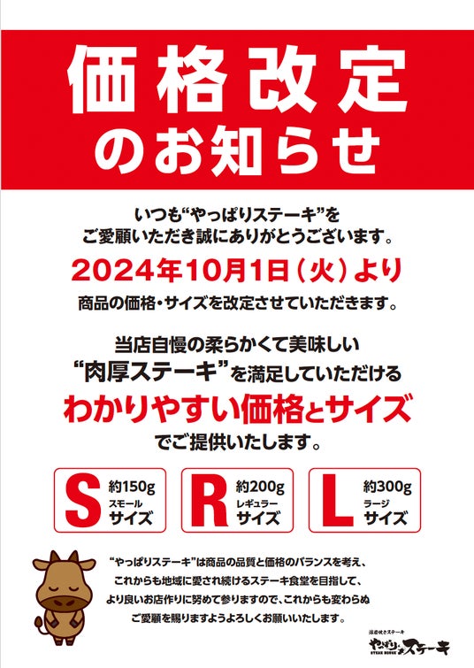 10月1日から、やっぱりステーキ全店でメニューの価格・規格を改定いたします。