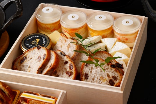 [弐ノ重(洋ノ重)] ローストビーフ、鴨のパテ、チキンロール、オリーブ、鮑のやわらか煮、フォアグラテリーヌ、キャビア、ホタテ貝柱のエスカベーシュ、生ハムとドライフルーツ、クルミグラッセ、合鴨の照り焼き、サーモンマリネといくら