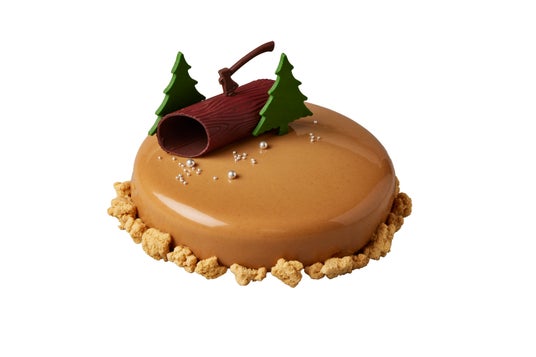 しっとりとしたアーモンドビスキュイに、酸味のあるカラマンシークリームとサクサクのパール、そしてなめらかなキャラメリアムースを重ねました。仕上げには、軽やかな食感のフィヤンティーヌが添えられ、エレガントで贅沢な味わいが楽しめる洗練されたケーキです。