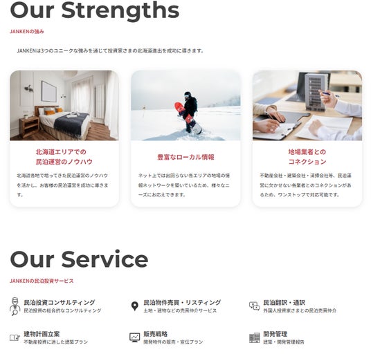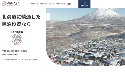 「JANKEN」は、北海道に特化した民泊関連事業で、「民泊投資」や「民泊視察」などのリゾート投資体験を提供します。サービスには、民泊投資のコンサルティング、物件や土地の買取、エリア視察ツアーが含まれており、また、Webサイトでは投資情報や北海道の観光情報を発信する「JANKENマガジン」を提供しています。JANKENによって、投資家は北海道での民泊事業に関する総合的なサポートを受けることができます。
