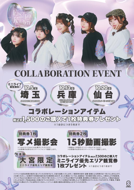 ・大宮:ミニライブ優先エリア条件:イベント当日、SPINNS大宮ARCHE店にて衛星とカラテア×SPINNSコラボレーション商品税込7,500円お買い上げで、1会計につき1枚「優先エリア閲覧券」を先着順でお渡しいたします。