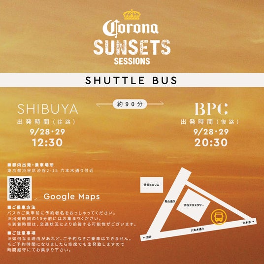 当日は、渋谷付近のバス発車指定場所にてシャトルバスにご乗車いただき、絶景の待つ「BPC」へとエスケープ。会場に到着後は、キンキンに冷えたコロナビールやメキシカンフードとともにスペシャルな音楽とサンセットを楽しんでいただきます。夏が終わりを迎える前に、心地よいライブ音楽が流れる空間で、気の合う仲間とサンセットをバックに極上の乾杯を楽しみませんか。