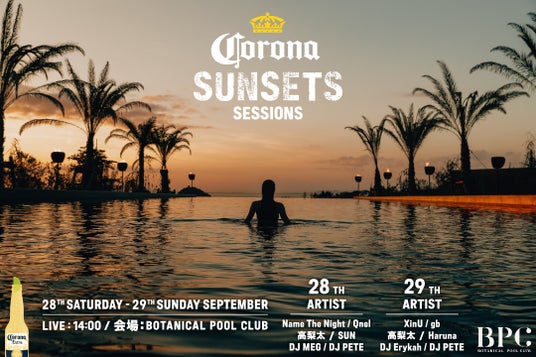 「BPC」で初開催される「CORONA SUNSETS SESSIONS」では、大自然に囲まれた「BOTANICAL POOL CLUB」のプールやサウナ、サンセットなど非日常を堪能しながら、「Name The Night」、「XinU」「Qnel」、「gb」などの豪華アーティスト12名の出演ほか、DJライブや当日参加できるプールサイドヨガ、オリジナルTシャツ・トートバッグをつくるシルクスクリーンワークショップなどを体験いただけます。